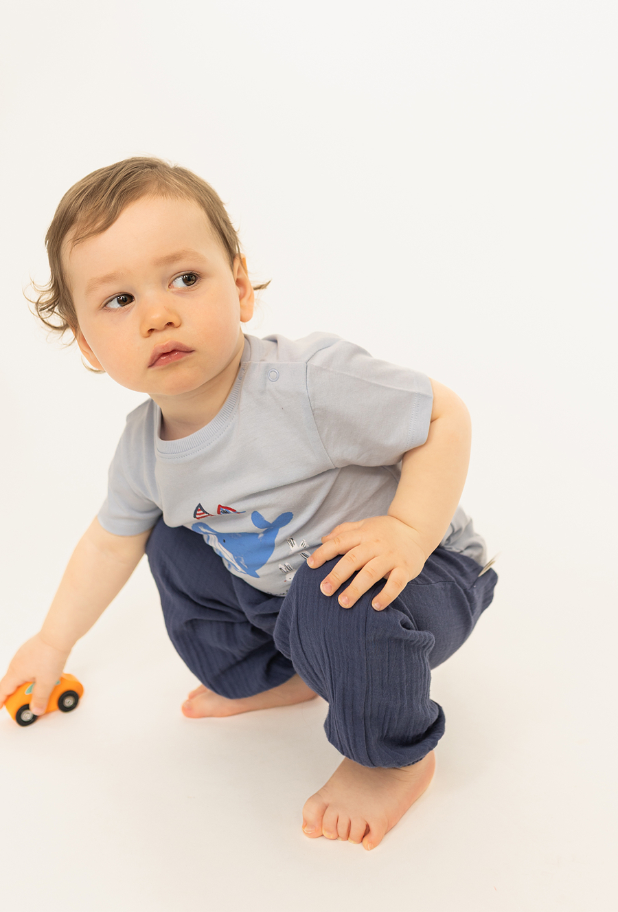 Granatowe spodnie niemowlęce wykonane z lekkiego, oddychającego muślinu, który zapewnia maksymalny komfort w cieplejsze dni. Luźny krój i elastyczny pas ułatwiają zakładanie oraz nie krępują ruchów podczas zabawy. Prosty design z subtelną naszywką nadaje spodniom naturalny i przyjemny wygląd – idealny wybór na lato.