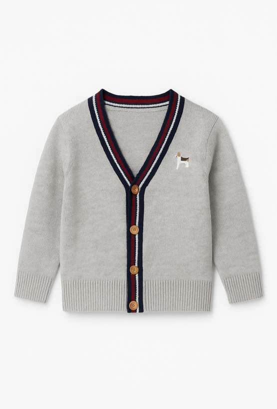 Szary sweter dla niemowlaka z klasycznym zapięciem na guziki i kontrastową, granatowo-bordową lamówką przy dekolcie i na przodzie. Na piersi subtelny haft w postaci małego pieska, który dodaje całości uroku. Miękka dzianina zapewnia ciepło i wygodę, a dopracowane wykończenia sprawiają, że to świetna propozycja zarówno na co dzień, jak i na bardziej eleganckie okazje.