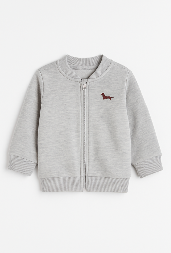 Jasnoszara bluza niemowlęca z wygodnym zapięciem na suwak i drobnym haftem w postaci biegnącego pieska. Wykończona ściągaczami przy rękawach i u dołu, co pomaga utrzymać ciepło. Miękki materiał zapewnia komfort noszenia, a praktyczny krój sprawdzi się zarówno w domu, jak i na spacerze. To uniwersalna bluza na chłodniejsze dni – ciepła, lekka i łatwa do zakładania.