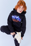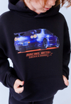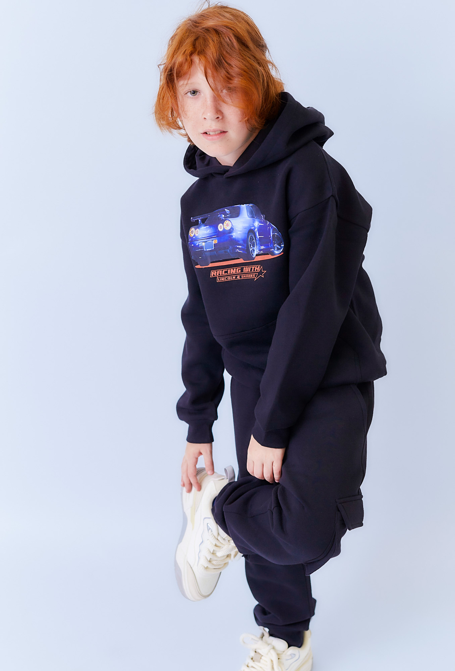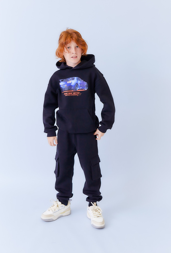 Czarna bluza chłopięca z kapturem i nadrukiem auta