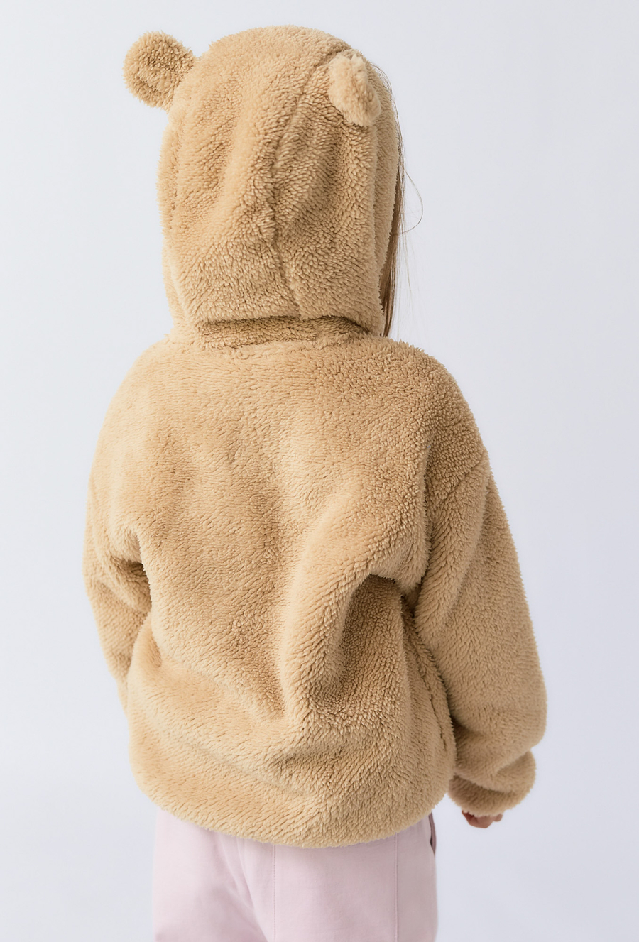 Urocza i funkcjonalna – taka właśnie jest nasza bluza rozpinana z kapturem i uszami misia dla dziewczynki. Wykonana z miękkiego polaru, zapewnia przyjemne ciepło i maksymalny komfort podczas noszenia. Ciepły kaptur z uszkami dodaje jej wyjątkowego uroku i sprawia, że dzieci ją uwielbiają!. Model zapinany na zamek, z lekko oversize'owym krojem, świetnie sprawdzi się zarówno jako warstwa wierzchnia w chłodniejsze dni, jak i jako część codziennej stylizacji do przedszkola, szkoły lub na spacer.