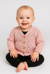 Miękki sweterek niemowlęcy w odcieniu pudrowego różu otula delikatnością i subtelnym wzorem ażurowym. Klasyczne zapięcie na guziki z imitacji drewna ułatwia zakładanie, a elastyczne wykończenia przy rękawach i dekolcie dbają o wygodę podczas noszenia. Lekki i przewiewny – sprawdzi się zarówno w domu, jak i na spacerze.