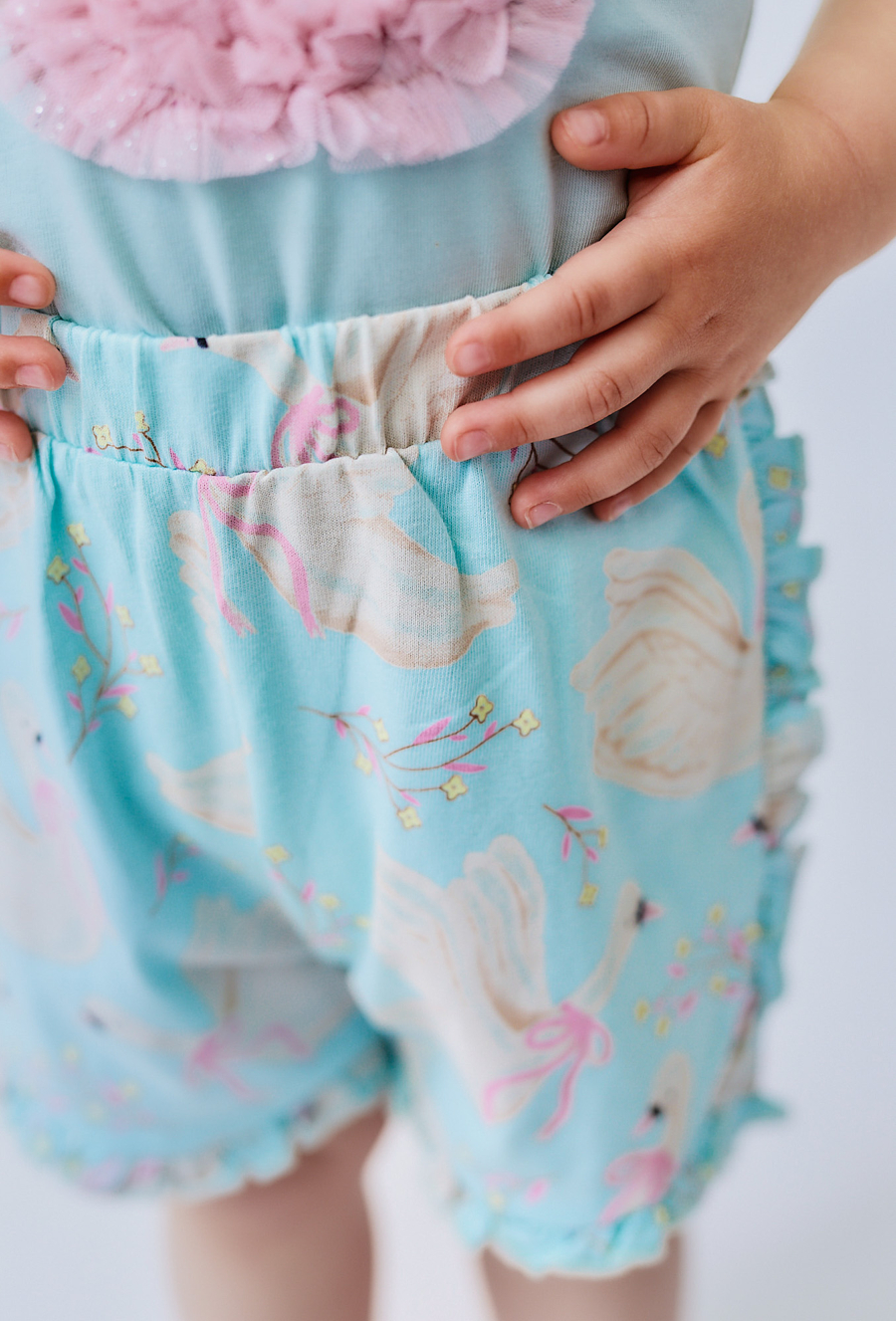 Miętowe szorty dziewczęce z uroczym nadrukiem w białe łabędzie i różowe akcenty. Model z elastyczną talią i delikatnymi falbankami po bokach, które dodają lekkości. Wykonane z przyjemnej w dotyku bawełny, która sprawdzi się w cieplejsze dni. Wygodne, lekkie i idealne na zabawę, spacer czy letni wypoczynek.