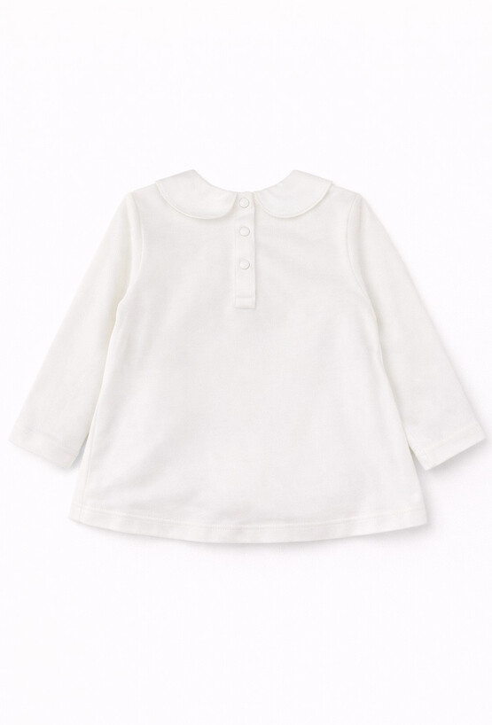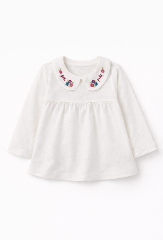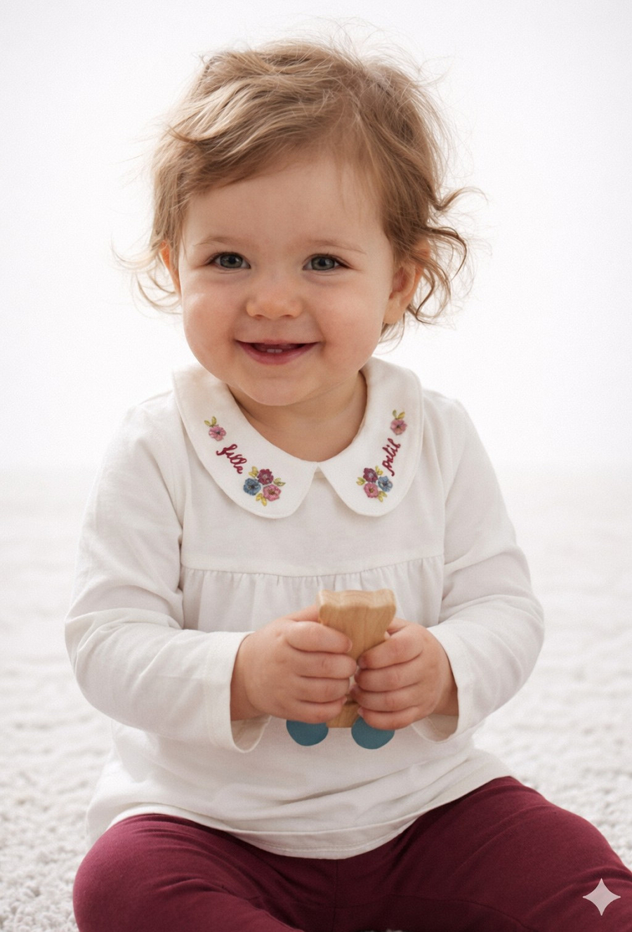 Elegancka biała bluzka z długim rękawem to ponadczasowa klasyka w dziewczęcej garderobie. Uszyta z miękkiej i przewiewnej 100% bawełny, zapewnia dziecku pełen komfort przez cały dzień. Model wyróżnia się dekoracyjnym kołnierzykiem z uroczym haftem – subtelne kwiatki i napis „petit” dodają całości wyjątkowego uroku. Delikatnie rozkloszowany krój zapewnia swobodę ruchów, a zapięcie na guziczek z tyłu ułatwia zakładanie przez główkę. Ta bluzka to idealny wybór zarówno do codziennych, jak i bardziej eleganckich stylizacji.