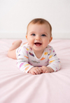 Białe body niemowlęce z długim rękawem to idealna propozycja dla maluszka na każdy dzień. W całości pokryte kolorowym nadrukiem w cukierki, prezentuje się wyjątkowo słodko i radośnie. Wykonane z przyjemnej w dotyku dzianiny (95% bawełna, 5% elastan), zapewnia wygodę i swobodę ruchów. Body zapinane na ramieniu i w kroku, co ułatwia szybkie przebieranie oraz przewijanie dziecka.