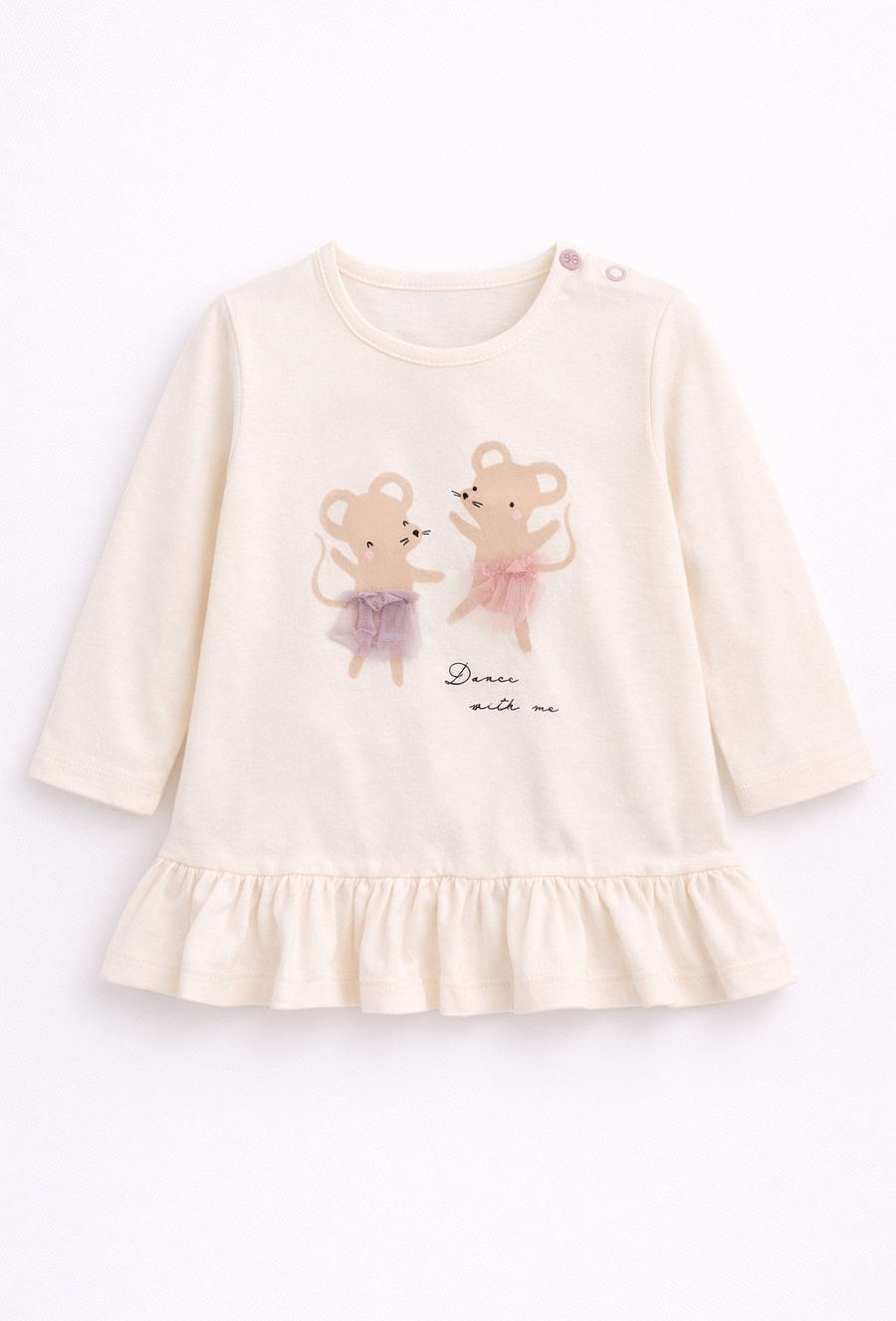 Ta dziewczęca tunika to połączenie wygody i subtelnych detali. Ozdobiona uroczym nadrukiem myszek, które mają dekoracyjne tiulowe spódniczki, zachwyca dziewczęcym charakterem. Miękki materiał zapewnia komfort noszenia, a luźniejszy fason nie krępuje ruchów maluszka. Idealna na co dzień – do legginsów, rajstopek czy spodenek.
