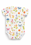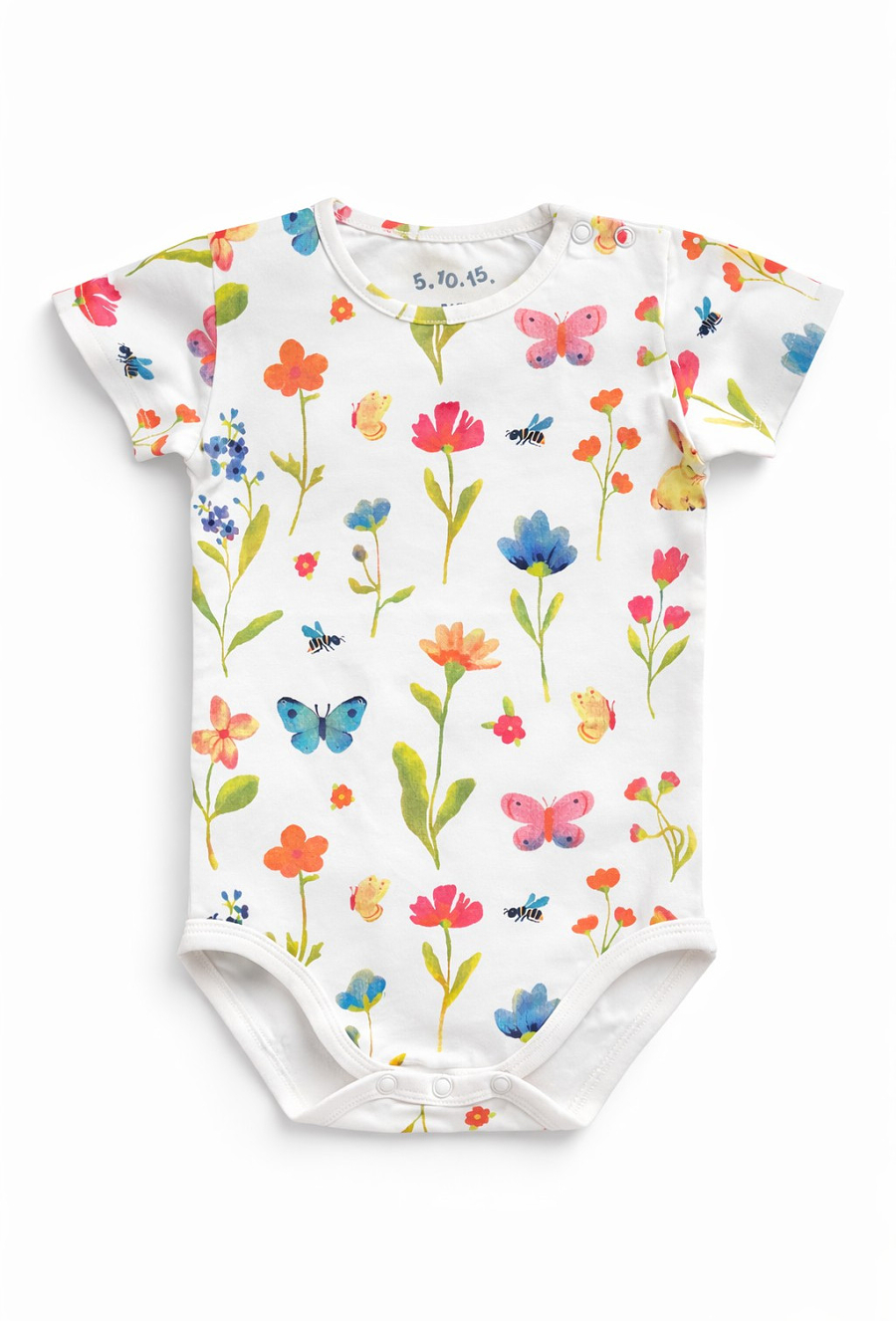 Delikatne body niemowlęce z krótkim rękawem, wykonane z miękkiej i elastycznej bawełny z dodatkiem elastanu. Uroczy, kolorowy print w kwiatki nadaje całości lekkości i dziewczęcego charakteru, idealnego na wiosenne i letnie dni. Materiał jest przyjemny w dotyku. Praktyczne napy w kroku ułatwiają szybkie przebieranie i zmianę pieluszki, co doceni każdy rodzic.