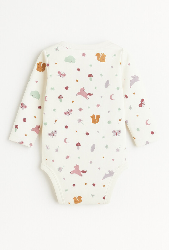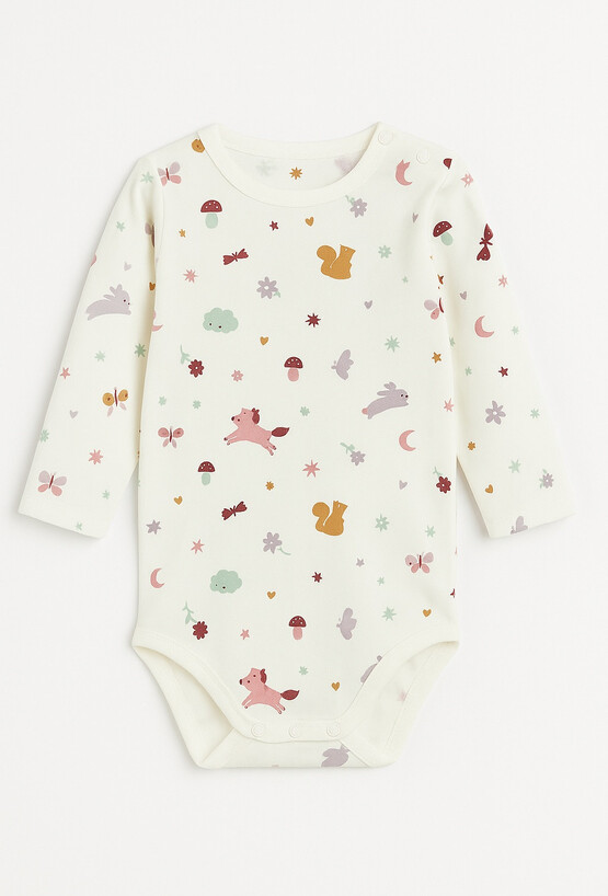 Delikatne body niemowlęce z długim rękawem, ozdobione uroczym nadrukiem w motywy zwierzątek. Połączenie 95% bawełny i 5% elastanu sprawia, że body jest miękkie, przewiewne, a jednocześnie elastyczne i wygodne w codziennym noszeniu. Zapięcie na napy w kroku ułatwia przebieranie i przewijanie maluszka. Idealny wybór dla dziewczynki na każdy dzień – zapewnia swobodę ruchów oraz przytulny komfort.