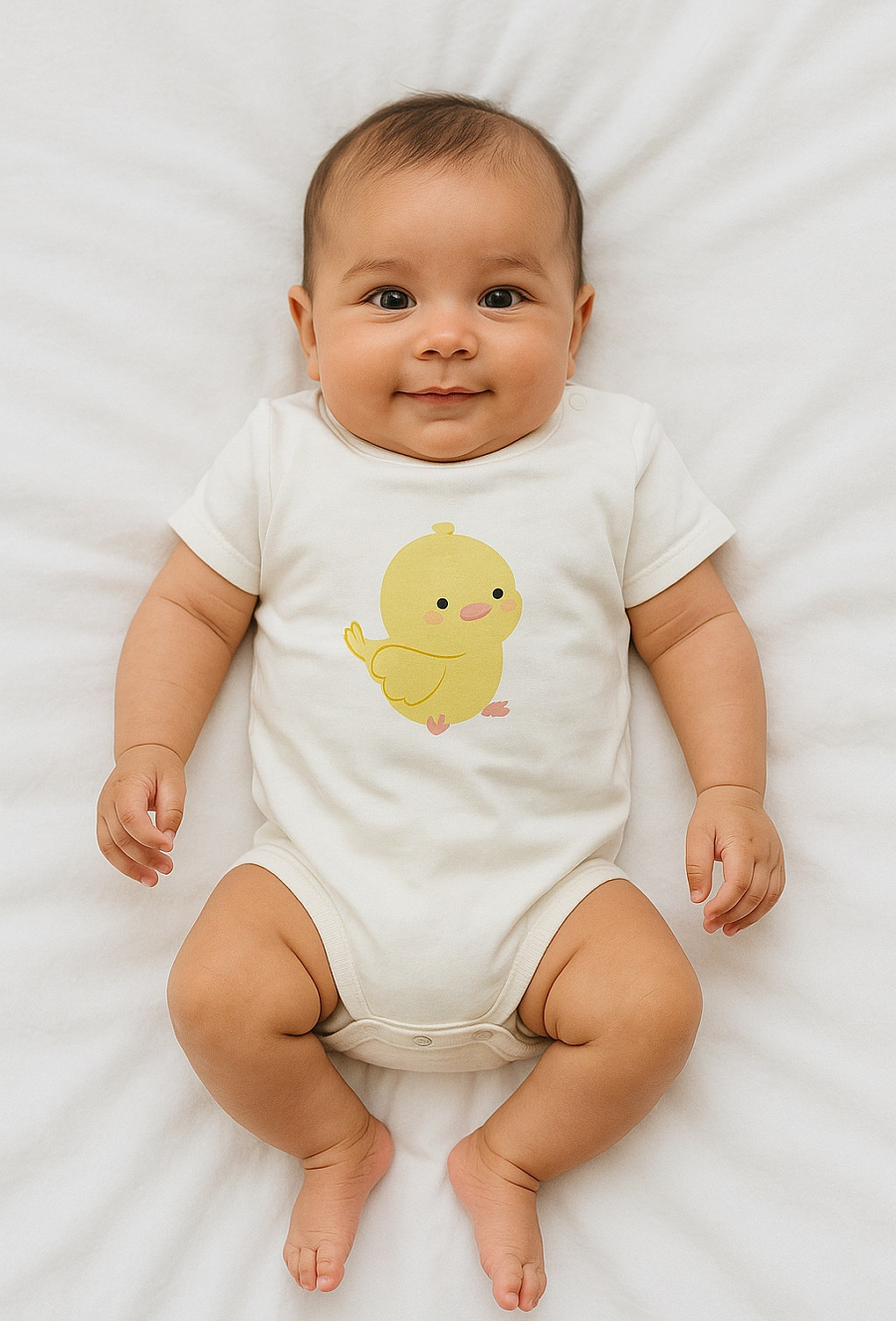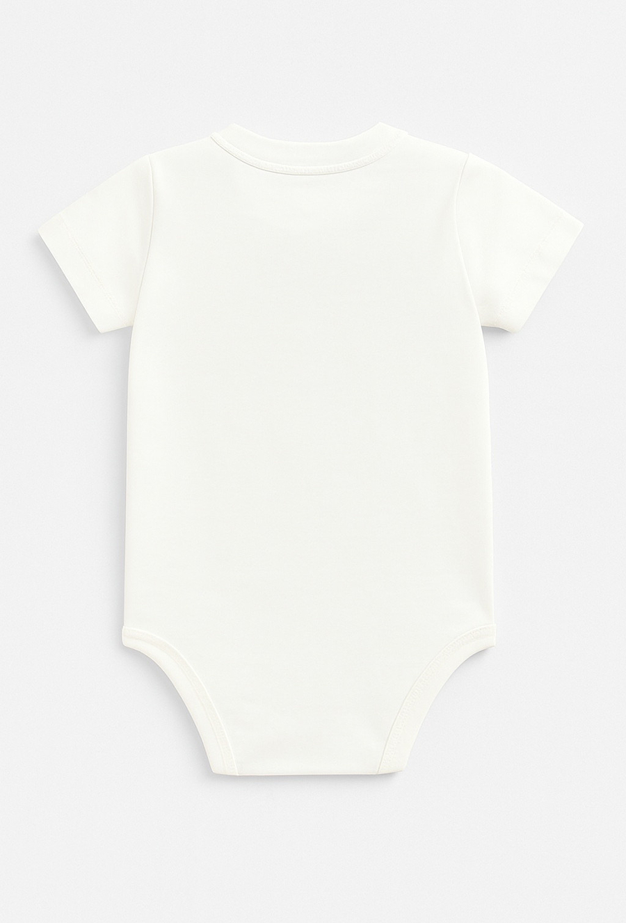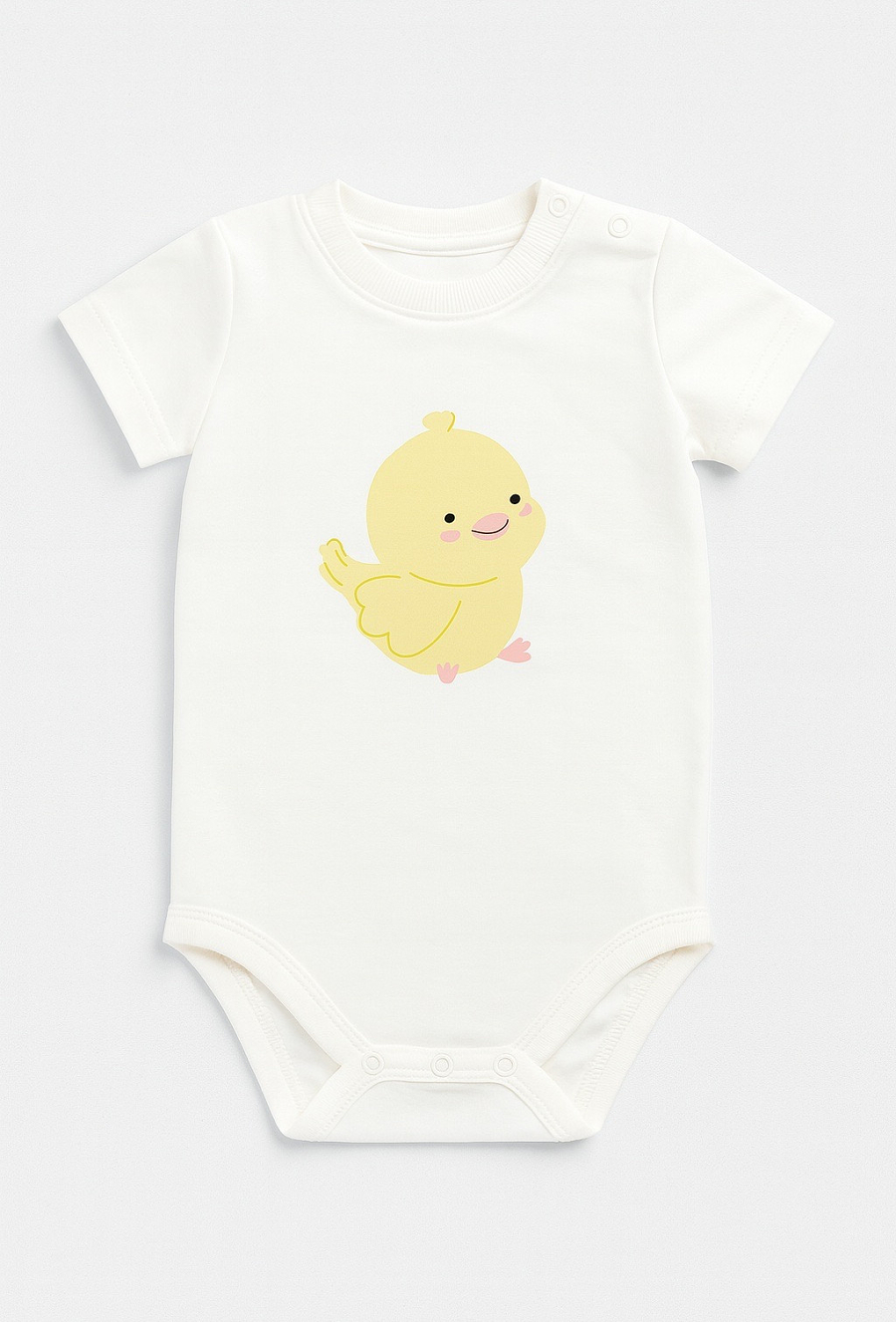 Białe body niemowlęce z krótkim rękawem wykonane z bawełny z dodatkiem elastanu to wygodna propozycja do codziennego noszenia. Elastyczny, dopasowujący się materiał zapewnia swobodę ruchów oraz komfort noszenia przez cały dzień. Model ozdobiony jest uroczym nadrukiem ptaszka umieszczonym na środku, który nadaje body delikatnego, dziecięcego charakteru. Miękka tkanina jest przyjemna w dotyku i bezpieczna dla wrażliwej skóry niemowlęcia.