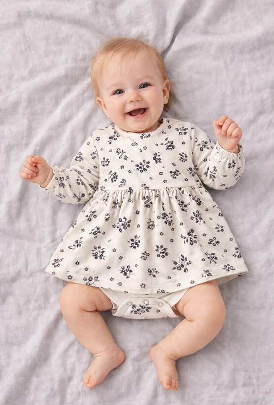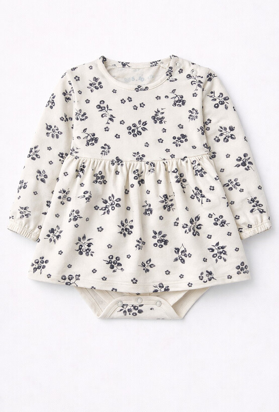 Urocze sukienko-body z długim rękawem. Delikatny print w kwiatki na całej powierzchni zachwyci każdą mamę poszukującą wyjątkowego stroju dla swojej pociechy. Wykonana z elastycznej cienkiej bawełny, zapewnia komfort i swobodę ruchów, idealną dla najmłodszych. Wykonana z miękkiej, elastycznej dzianiny bawełnianej z dodatkiem elastanu. Praktyczne napy w kroku ułatwiają przewijanie, a długie rękawy sprawdzą się idealnie w chłodniejsze dni.
