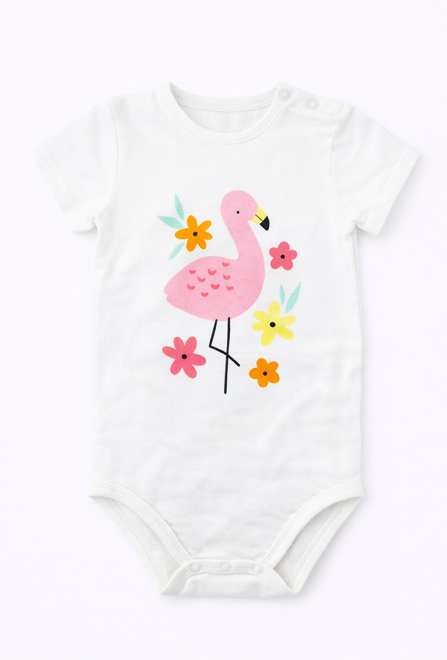 Jasne body niemowlęce z krótkim rękawem, ozdobione uroczym nadrukiem różowego flaminga i kolorowych kwiatków. Miękkie i przyjemne w dotyku, zapinane w kroku dla wygody przebierania. Idealne na cieplejsze dni – zapewnia swobodę ruchów i wygodę przez cały dzień.