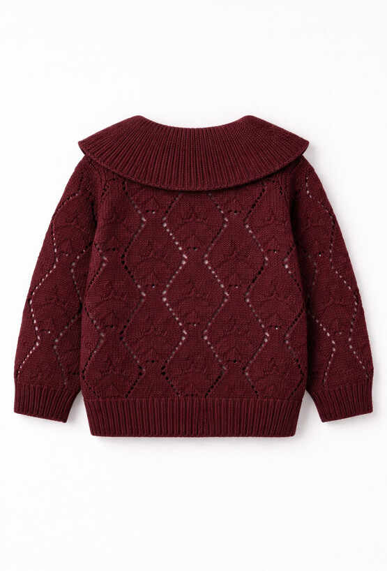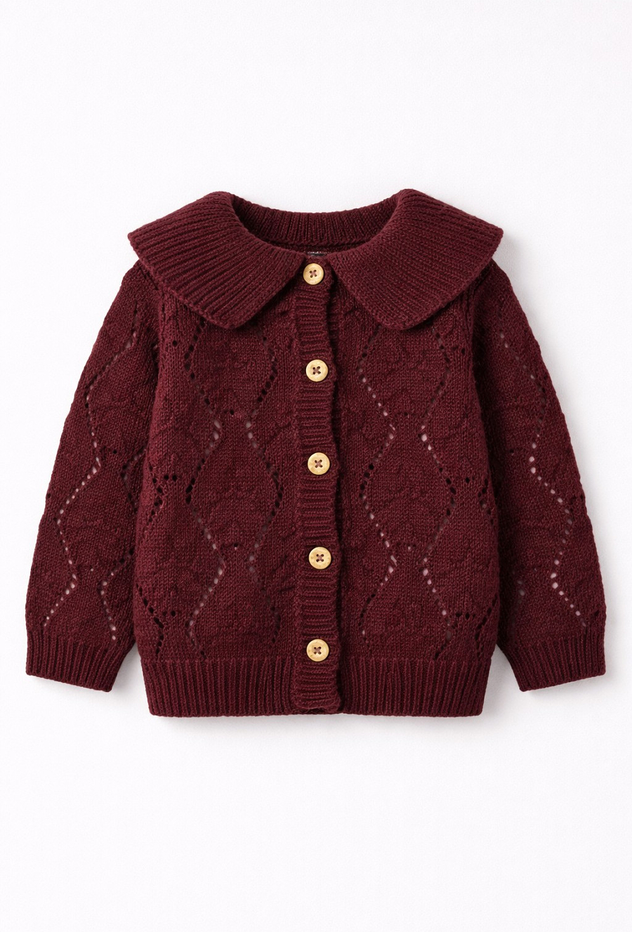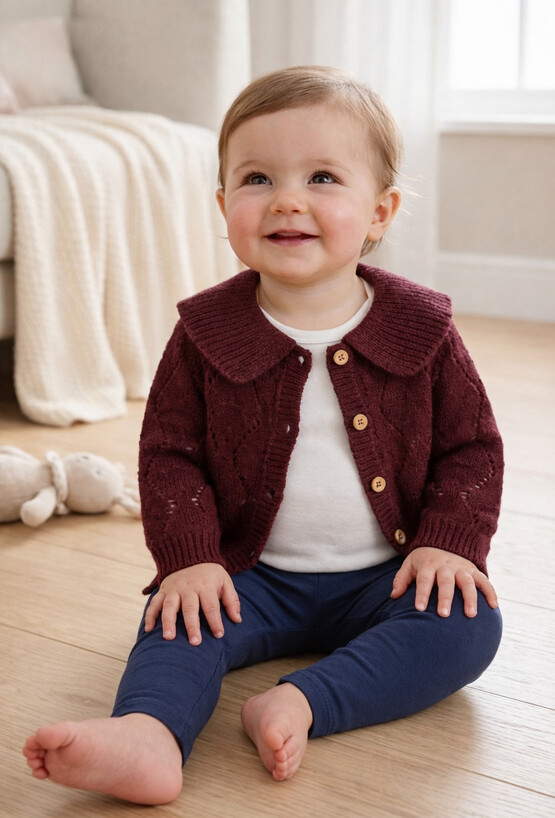 Miękki burgundowy sweter rozpinany to idealny wybór dla niemowlaka na chłodniejsze dni. Klasyczny fason z uroczym kołnierzykiem dodaje mu elegancji, a wygodne zapięcie ułatwia ubieranie malucha. Przyjemna w dotyku tkanina zapewnia komfort noszenia, nie podrażniając delikatnej skóry dziecka. Doskonale sprawdzi się zarówno na co dzień, jak i na bardziej wyjątkowe okazje.