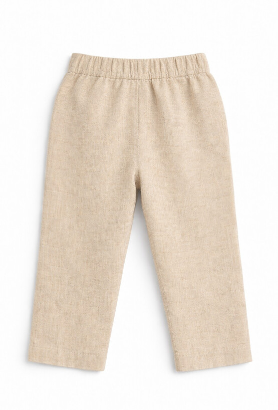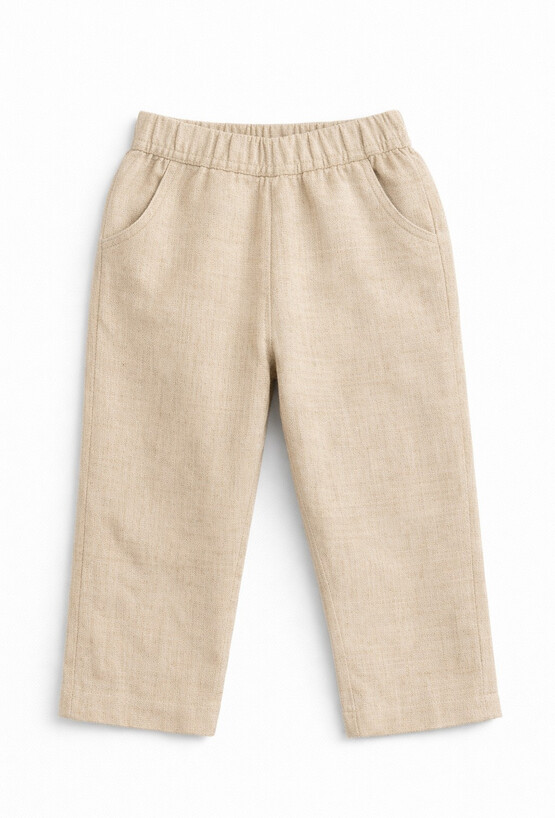 Stylowe i wygodne eleganckie spodnie typu haremki dla niemowlaka dziewczynki w naturalnym beżowym kolorze. Uszyte z przewiewnej tkaniny z domieszką lnu, dzięki czemu świetnie sprawdzą się w cieplejsze dni. Miękka gumka w pasie ułatwia zakładanie i zapewnia komfort, a praktyczne kieszonki dodają uroku i funkcjonalności.