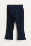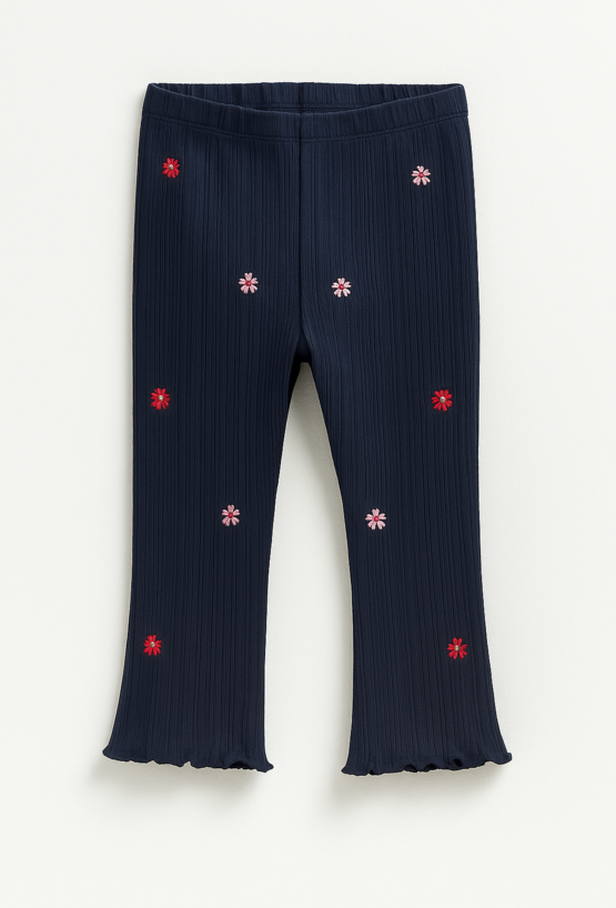 Wygodne legginsy dziewczęce uszyte z miękkiego, prążkowanego materiału z dodatkiem elastanu. Granatowa baza ozdobiona została urokliwymi naszywkami w kształcie kwiatków, co dodaje ubraniu delikatnego, dziewczęcego charakteru. Dzięki elastycznemu pasowi i wysokiej zawartości bawełny legginsy są nie tylko komfortowe, ale i przewiewne. Falowane wykończenie nogawek dodaje uroku, a fason sprawdzi się zarówno na co dzień, jak i na specjalne okazje.