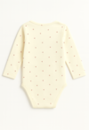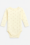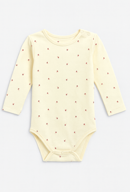 Urocze body niemowlęce z długim rękawem w kolorze delikatnej żółci ozdobione subtelnym nadrukiem drobnych kwiatków to świetny wybór do codziennej stylizacji maluszka. Wykonane z przyjemnej w dotyku dzianiny bawełnianej z dodatkiem elastanu, zapewnia idealne dopasowanie do ciała, a jednocześnie pełną swobodę ruchów. Zapięcie na ramieniu oraz w kroku ułatwia przebieranie, co czyni je wyjątkowo praktycznym rozwiązaniem.
