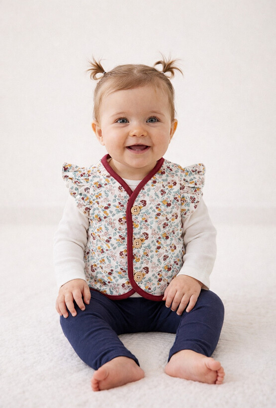 Stylowa kamizelka dla dziewczynki z nadrukiem w drobne kwiatki to doskonały wybór na każdą porę roku. Została uszyta z miękkiej, 100% bawełny i wykończona pikowaną podszewką, co zapewnia dziecku komfort i ciepło. Zapinana na trzy drewniane guziki, doskonale sprawdzi się jako uzupełnienie stylizacji na co dzień i od święta.
