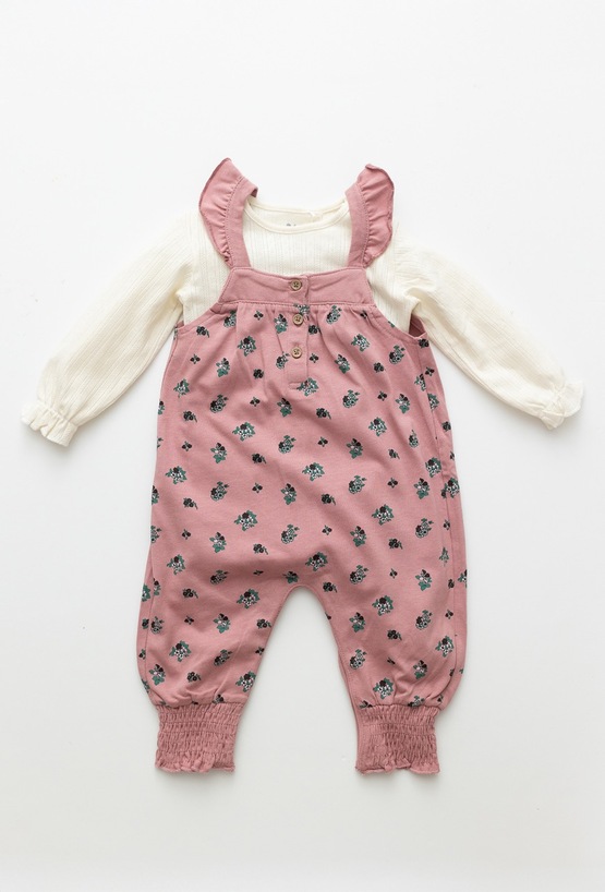 Wyjątkowo uroczy komplet dla niemowląt. Zestaw składa się z różowych ogrodniczek z nadrukiem i falbankami na ramiączkach oraz kremowych body z długim rękawem. Oba elementy uszyte są z 100% miękkiej bawełny, co gwarantuje komfort i bezpieczeństwo dla wrażliwej skóry dziecka. W produkcie zastosowano praktyczne zapięcie na napy, ułatwiające przewijanie.
