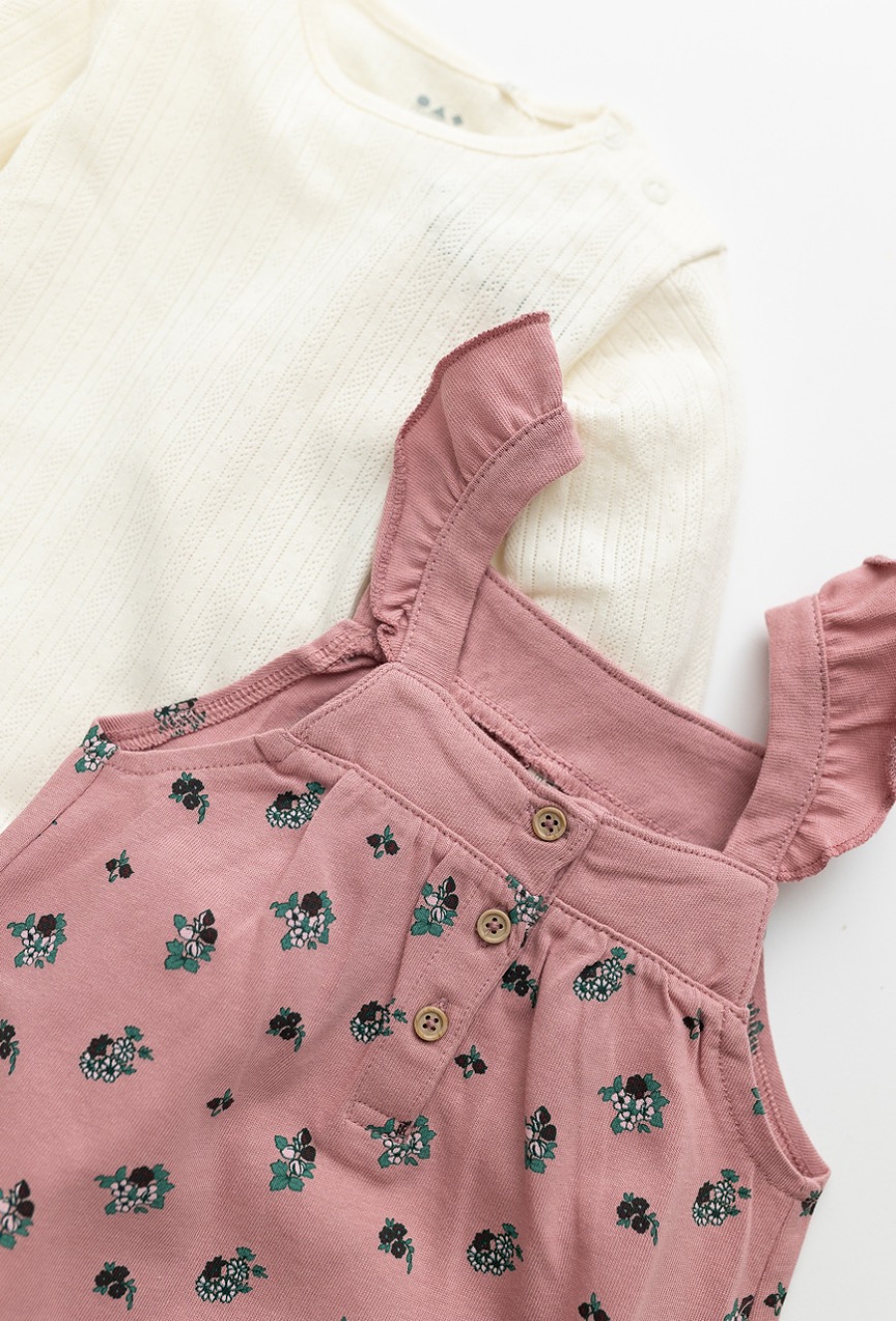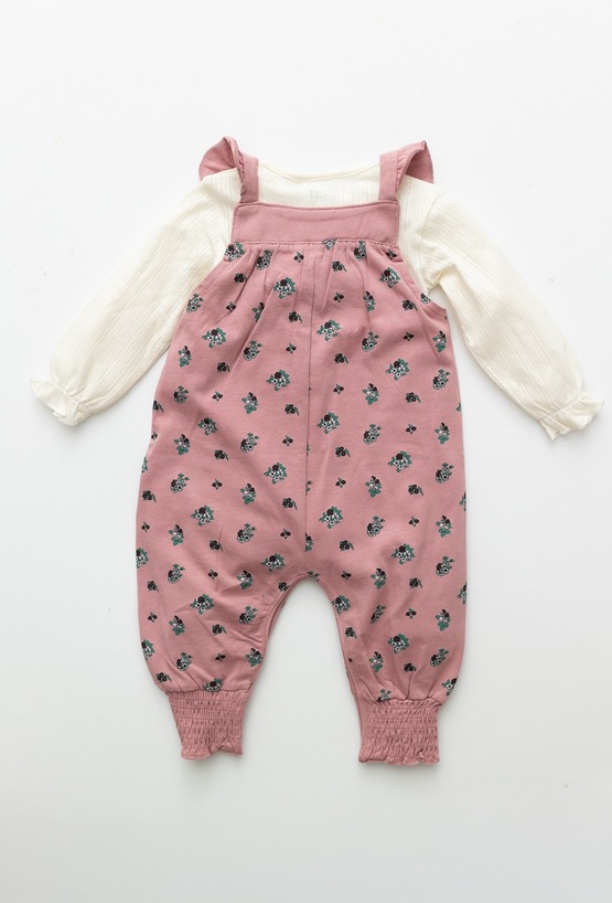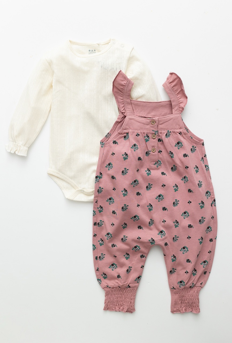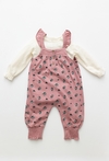 Komplet niemowlęcy – różowe ogrodniczki i kremowe body