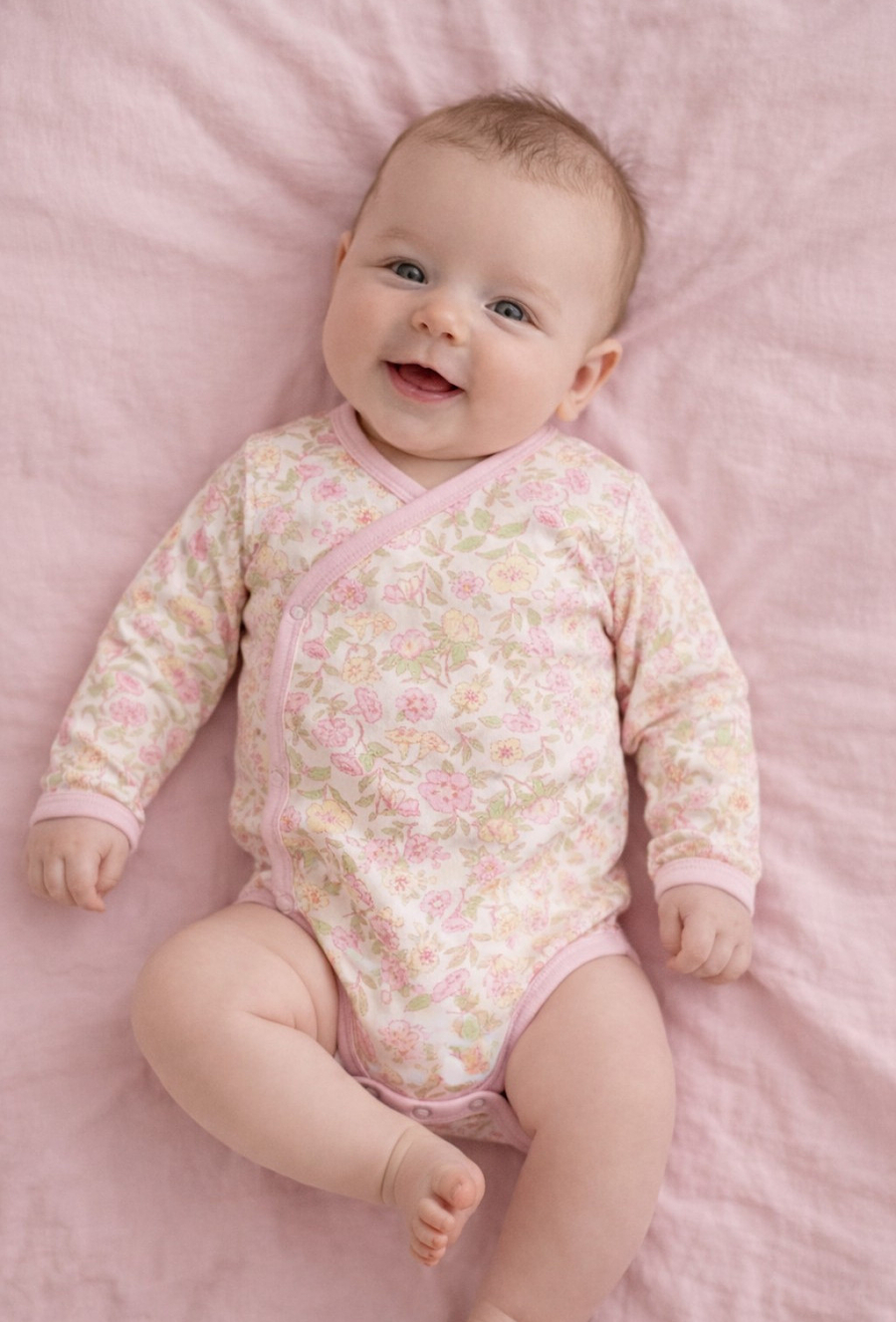 Dziewczęce body niemowlęce z długim rękawem, ozdobione subtelnym, różowym kwiatowym nadrukiem. Kopertowe zapięcie ułatwia przebieranie i zapewnia wygodę zakładania, szczególnie u noworodków. Miękka bawełna i staranne wykończenie sprawiają, że body jest przyjazne dla wrażliwej skóry dziecka. Idealne jako baza codziennego stroju.