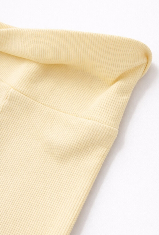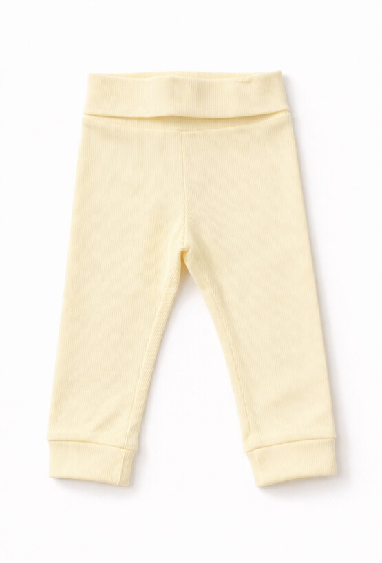 Legginsy niemowlęce GROW WITH ME w jasnym, żółtym odcieniu. Wykonane z elastycznej dzianiny w prążek (95% bawełna, 5% elastan) dobrze dopasowują się do sylwetki i zapewniają pełną swobodę ruchów. Szeroki pas wygodnie leży na brzuszku, a wykończenie nogawek mankietami pomaga utrzymać legginsy na miejscu. Idealne jako baza codziennych zestawów – do body, bluzek i sweterków.
