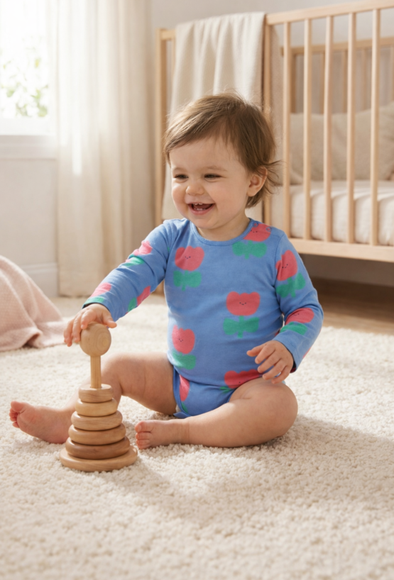 Radosne niebieskie body niemowlęce z długim rękawem wyróżnia się kolorowym nadrukiem all over print w urocze kwiatki, które dodają mu dziecięcego uroku. Klasyczny fason zapewnia wygodę, a praktyczne zapięcie w kroku ułatwia przewijanie i przebieranie maluszka. Wykonane z miękkiej, elastycznej dzianiny – 95% bawełny i 5% elastanu – jest przyjazne dla wrażliwej skóry dziecka i zapewnia swobodę ruchów. Doskonałe na co dzień, zarówno w domu, jak i na spacer. Świetnie pasuje do legginsów, spodni lub spódniczki, tworząc komfortowy zestaw dla maluszka.