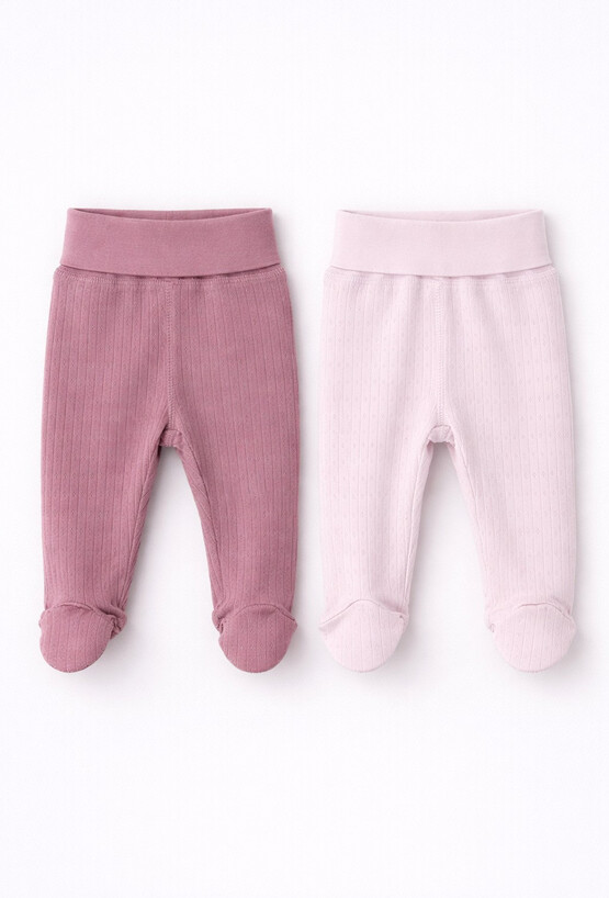 Komplet dwóch par półśpiochów niemowlęcych z dzianiny prążkowanej – w jasnoróżowym i malinowym odcieniu. Wykonane w 100% z bawełny, są miękkie i przyjemne w dotyku. Szeroki, bezuciskowy pas delikatnie otula brzuszek, zapewniając wygodę przez cały dzień. Elastyczne ściągacze przy nogawkach utrzymują ubranko na miejscu, nie krępując ruchów dziecka. Idealne zarówno na co dzień, jak i do spania. Uwaga: rozmiary do 74 mają stópki.