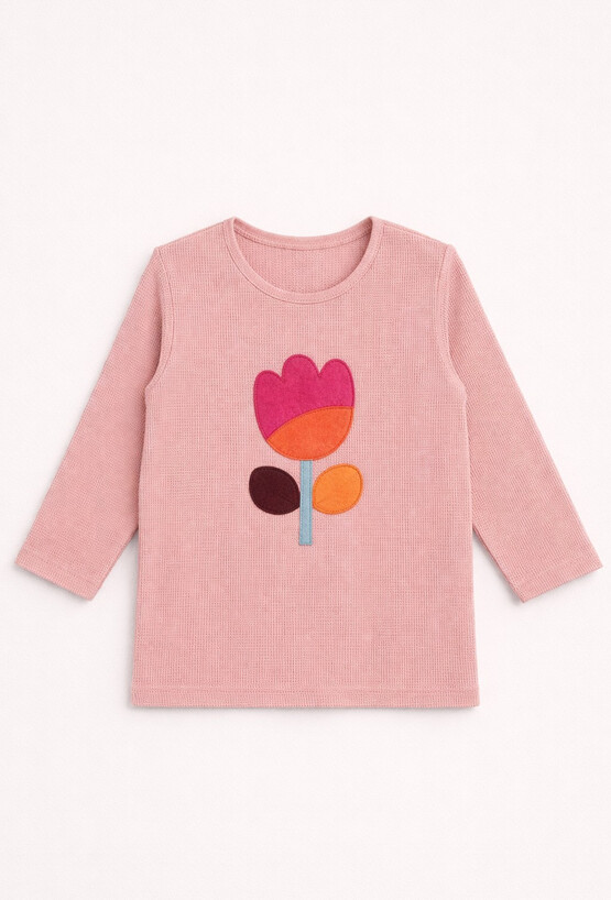 Ta różowa bluzka z długim rękawem to doskonały wybór do codziennych stylizacji każdej małej dziewczynki. Wykonana z wysokiej jakości materiału (95% bawełna, 5% elastan), gwarantuje wygodę i dopasowanie podczas zabawy i odpoczynku. Bluzka wyróżnia się efektowną, dużą naszywką w formie kwiatka, wzbogaconą dekoracyjnym haftem. Materiał nadaje modny, strukturalny wygląd oraz lekko rozciągliwy charakter, co sprawia, że dobrze układa się na ciele dziecka. Idealna do legginsów, spódniczek czy ogrodniczek.
