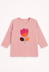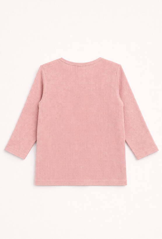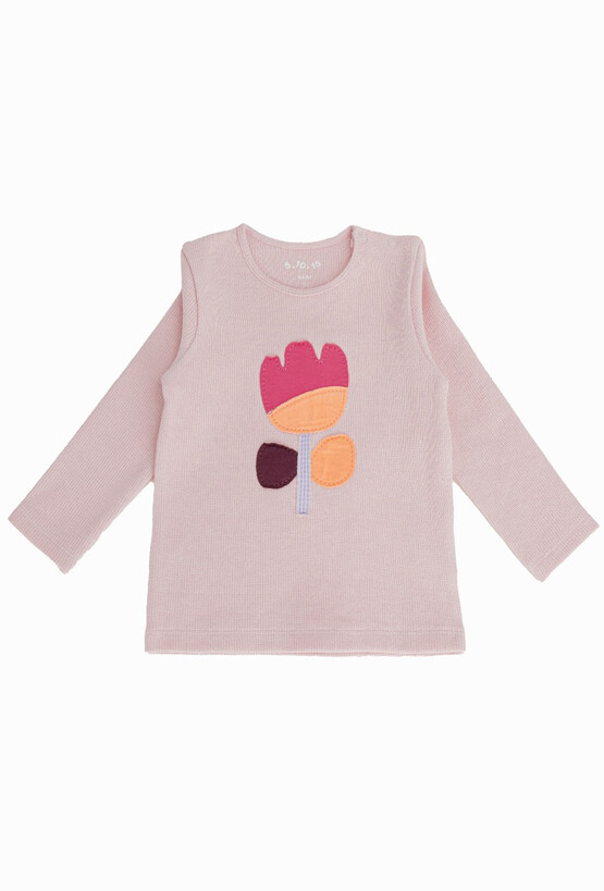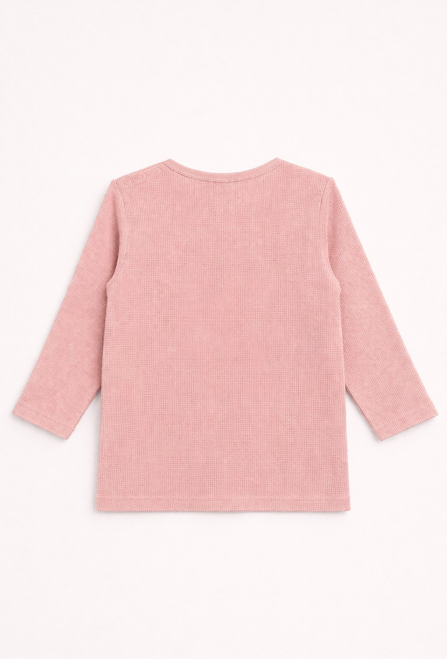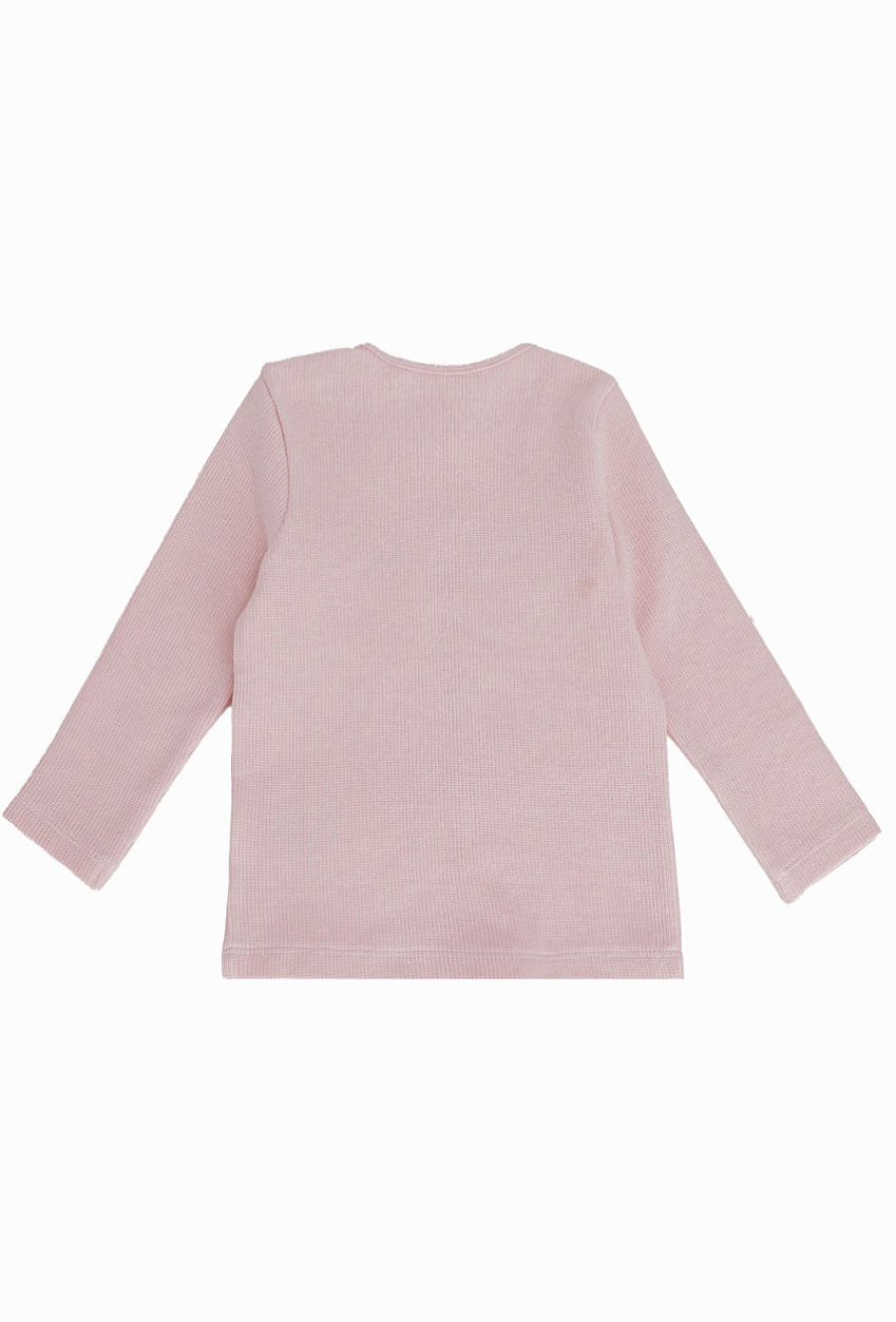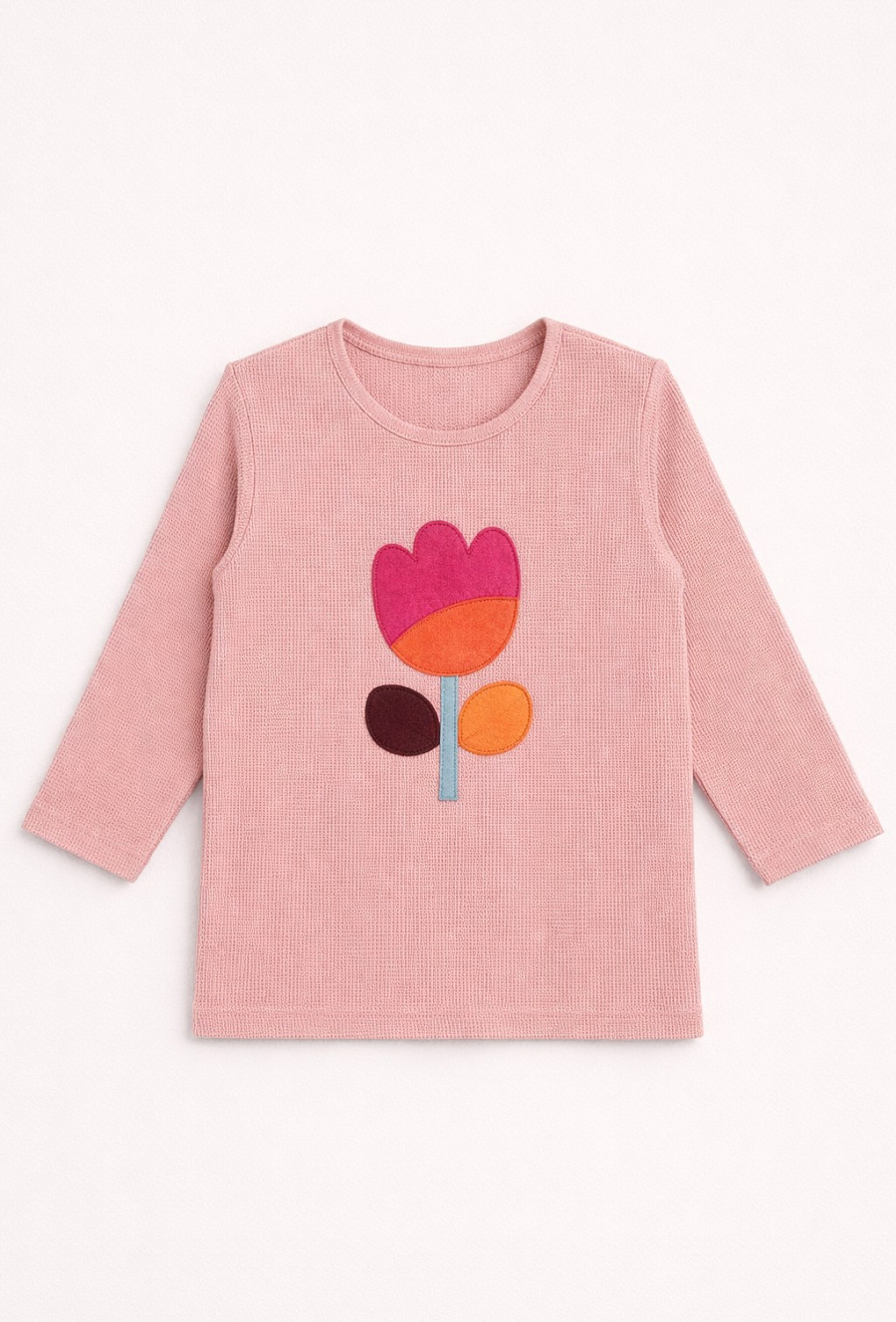 Różowa bluzka dziewczęca z długim rękawem i naszywką.