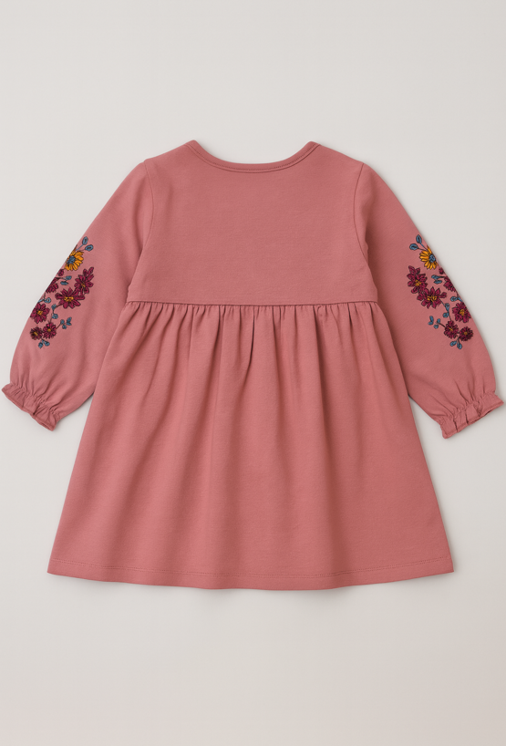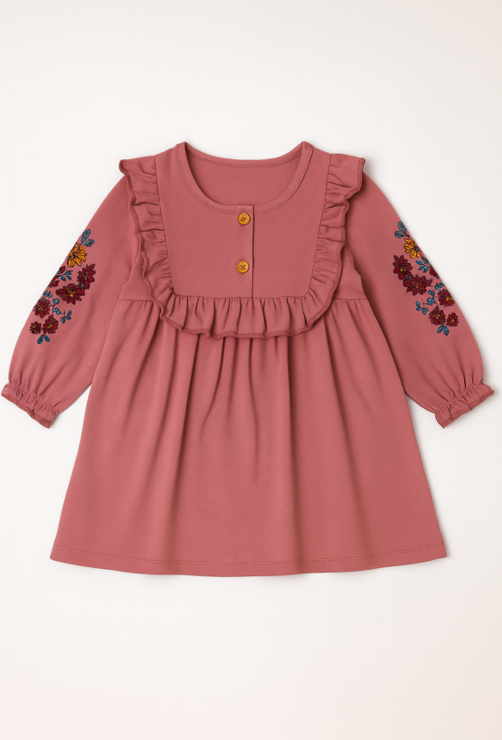 Ta dziewczęca sukienka z długim rękawem to połączenie wygody i elegancji. Wykonana z 100% naturalnej bawełny, jest delikatna dla skóry dziecka i doskonała na każdą porę roku. Ozdobne hafty na rękawach dodają uroku, a falbanka z przodu podkreśla dziewczęcy styl. Zapięcie na guziki ułatwia zakładanie, a elastyczne wykończenie rękawów zapewnia komfort noszenia. Idealna na rodzinne spotkania, przedszkole czy codzienne zabawy – ta sukienka to uniwersalna propozycja dla każdej małej elegantki.