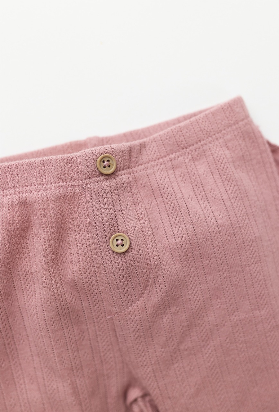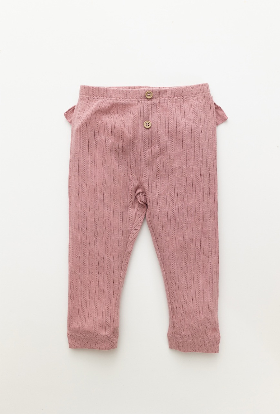 Urocze różowe legginsy niemowlęce dla dziewczynki wykonane z delikatnej dzianiny pointelle to doskonały wybór na co dzień. Materiał jest miękki, przewiewny i w 100% bawełniany, dzięki czemu zapewnia maksymalny komfort i bezpieczeństwo dla wrażliwej skóry dziecka. Subtelne falbanki dodają legginsom uroku, a elastyczny pas ułatwia zakładanie i zapewnia wygodne dopasowanie. Klasyczny krój sprawia, że świetnie pasują zarówno do codziennych, jak i bardziej eleganckich stylizacji. Idealne do kompletu z tuniką, sweterkiem lub body.