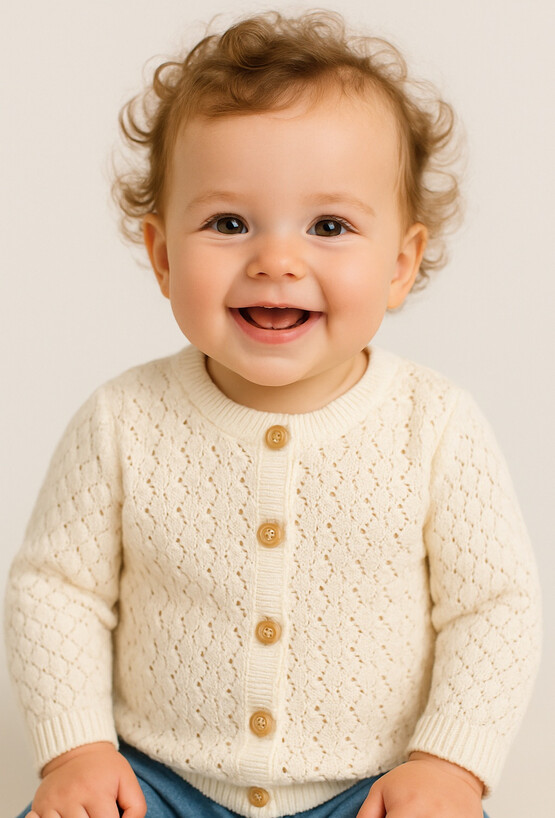 Ten kremowy sweter niemowlęcy to idealne połączenie delikatności i wygody! Wykonany z miękkiego materiału, ozdobiony subtelnym ażurowym wzorem, który dodaje całości lekkości i uroku. Naturalne drewniane guziki nie tylko pięknie się prezentują, ale także ułatwiają zakładanie sweterka. Falbankowe wykończenie przy rękawach i dekolcie dodaje romantycznego charakteru. Sweterek świetnie sprawdzi się zarówno na co dzień, jak i na wyjątkowe okazje, zapewniając maluchowi ciepło i komfort przez cały dzień.