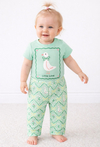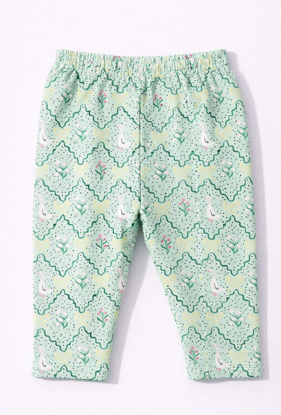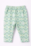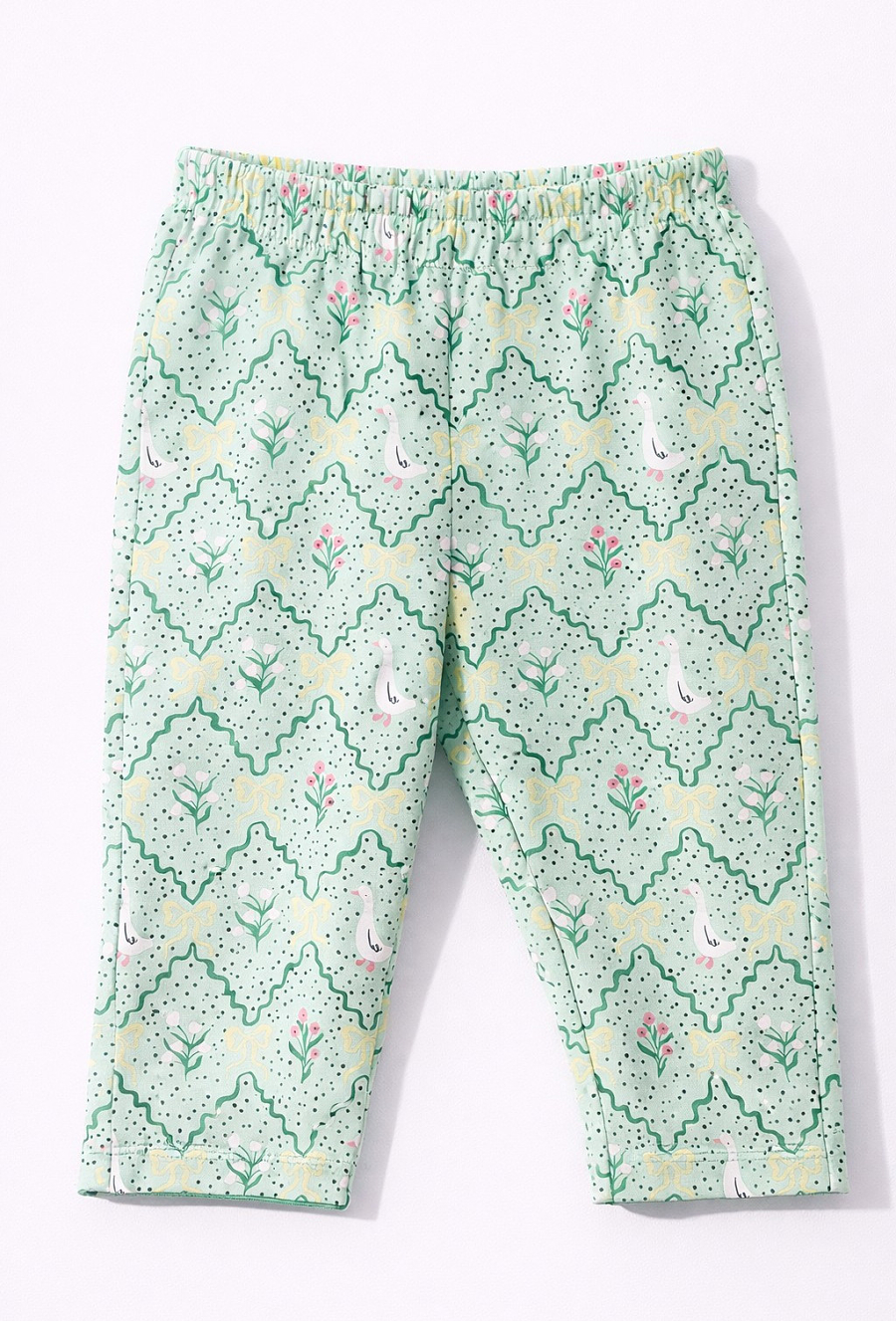 Zielone spodnie dresowe dla niemowlaka dziewczynki wykonane z miękkiej bawełny. Model wyróżnia się kolorowym nadrukiem na całej powierzchni, który dodaje stylizacji uroku i dziecięcego charakteru. Elastyczna guma w pasie zapewnia wygodę i nie uciska brzuszka, dzięki czemu spodnie doskonale sprawdzają się podczas codziennych aktywności, zabawy i odpoczynku. Przyjemny w dotyku materiał z podbiciem pętelkowym gwarantuje komfort noszenia przez cały dzień. To praktyczny i efektowny element niemowlęcej garderoby, idealny do noszenia z body, bluzą lub t-shirtem.
