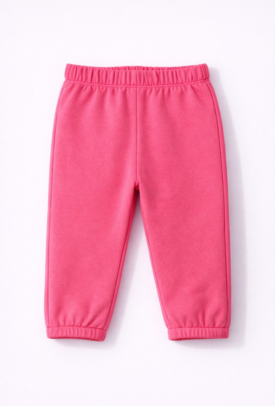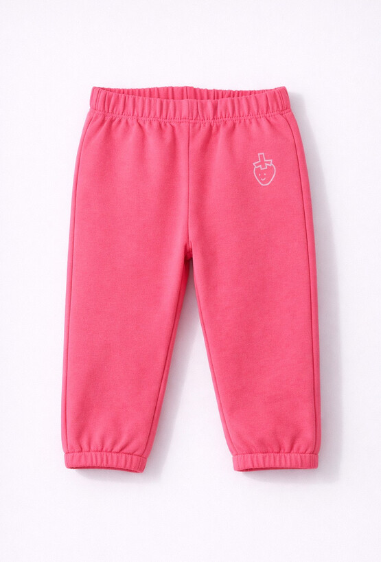 Różowe spodnie dresowe niemowlęce dla dziewczynki, wykonane w 100% z bawełny, zapewniającej komfort i delikatność dla wrażliwej skóry dziecka. Model uszyty z miękkiego, elastycznego materiału o wykończeniu dresowym, z przyjemną w dotyku warstwą wewnętrzną. Spodnie posiadają elastyczną gumkę w pasie oraz ściągacze na nogawkach. Uroczy print truskawka dodaje całości dziewczęcego i radosnego charakteru.