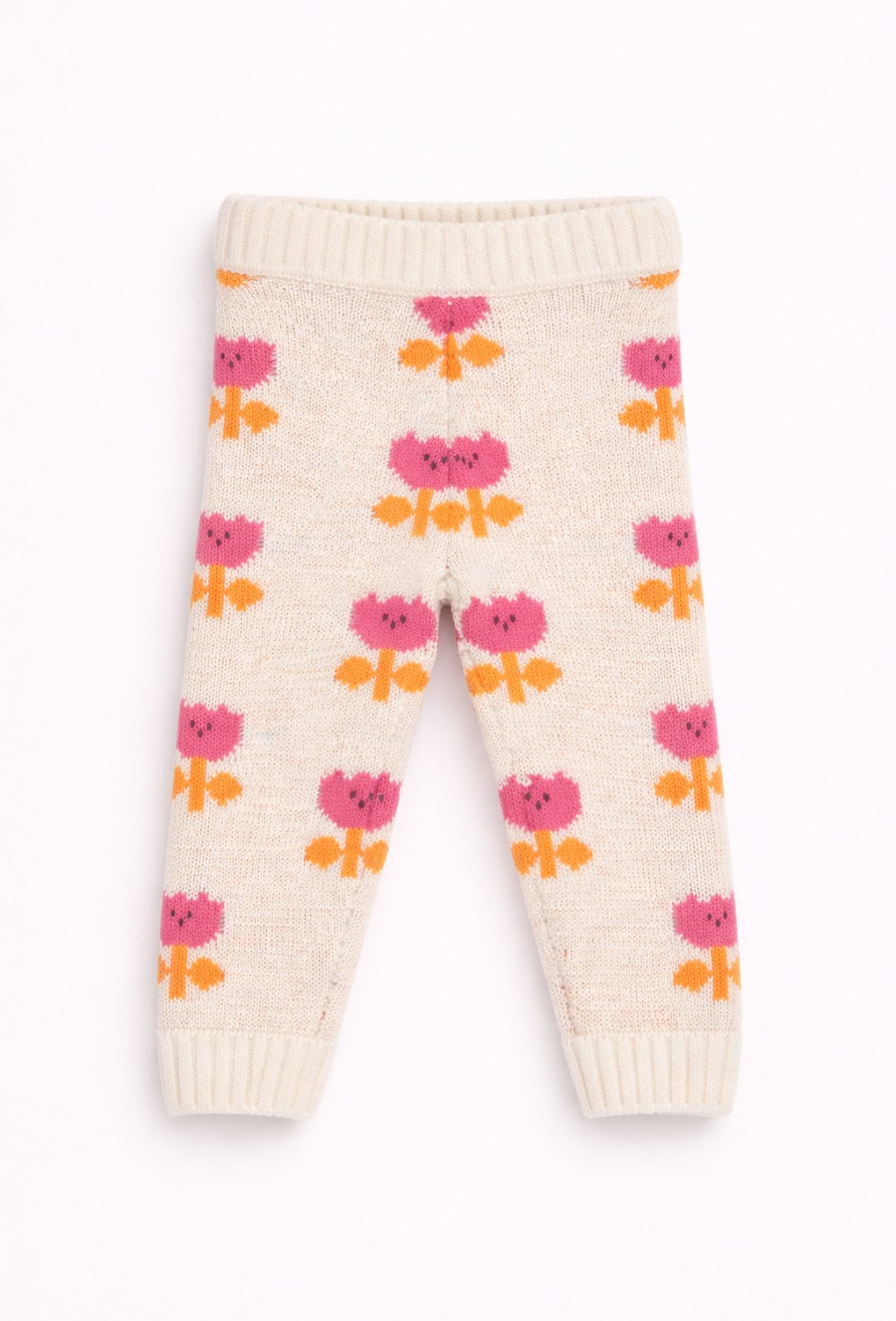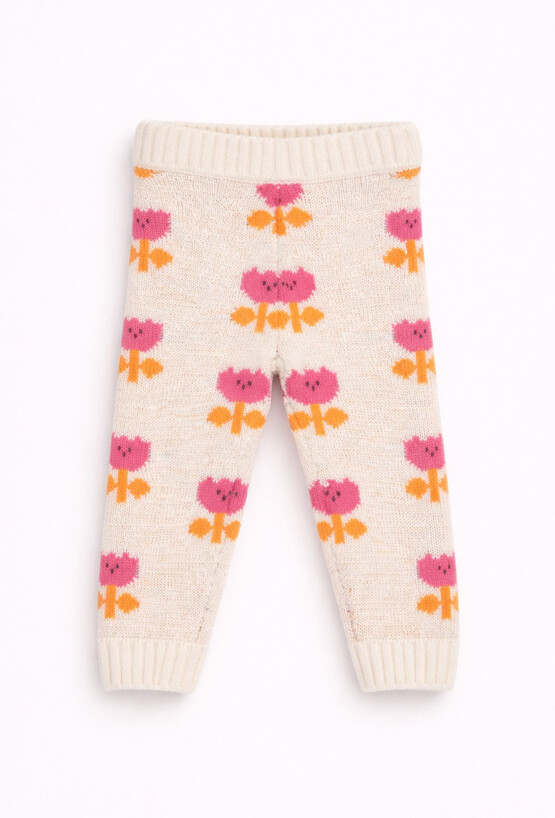 Te urocze dzianinowe spodnie dziewczęce w kolorze ecru zostały wykonane w 100% z miękkiej i przyjaznej dla skóry bawełny. Swetrowy splot oraz żakardowy wzór w kolorowe kwiatki sprawiają, że spodnie są nie tylko stylowe, ale i bardzo komfortowe. Model idealnie sprawdzi się na chłodniejsze dni – zapewnia ciepło, a jednocześnie pełną swobodę ruchów. Elastyczny pas gwarantuje wygodne dopasowanie.