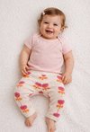 Różowe legginsy niemowlęce z naszywkami kwiatków na kolankach