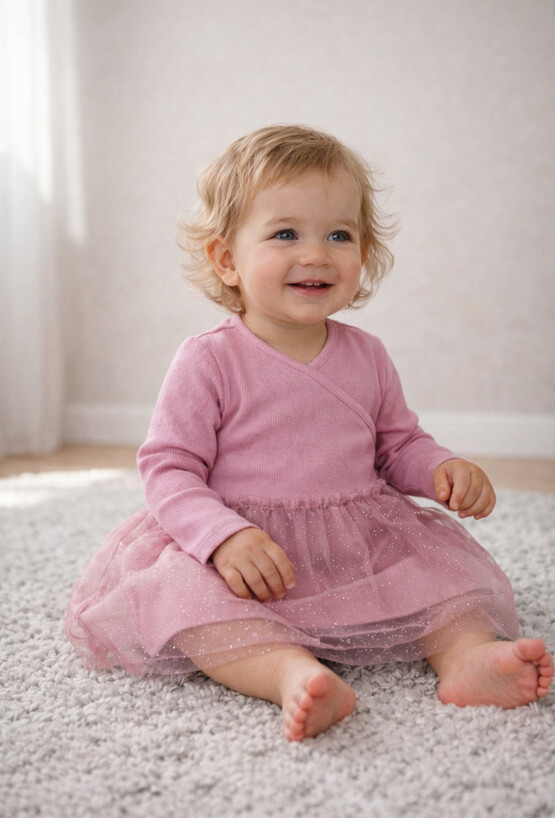 Urocza sukienka z tiulowym dołem to idealna propozycja dla małej księżniczki. Góra wykonana z miękkiego, przyjemnego w dotyku materiału zapewnia komfort noszenia, a delikatny tiulowy dół dodaje sukience wyjątkowego uroku. Subtelne detale sprawiają, że sukienka doskonale sprawdzi się na specjalne okazje, takie jak uroczystości rodzinne czy sesje zdjęciowe. Lekka i wygodna, pozwala maluszkowi czuć się swobodnie, jednocześnie zachwycając swoim dziewczęcym stylem. Idealny wybór dla małych dam!