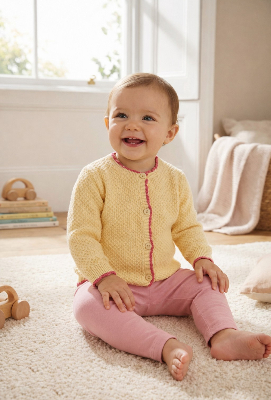 Żółty sweter niemowlęcy rozpinany wykonany w 100% z bawełny to klasyczna i stylowa propozycja do codziennych stylizacji. Miękka, przyjemna w dotyku dzianina zapewnia komfort noszenia oraz jest delikatna dla wrażliwej skóry dziecka. Model wyróżnia się kontrastowym wykończeniem wzdłuż zapięcia, które nadaje swetrowi subtelnego, dekoracyjnego charakteru. Klasyczny model sprawia, że sweter doskonale sprawdzi się zarówno na co dzień, jak i na bardziej eleganckie okazje. Rozpinane zapięcie na guziki ułatwia ubieranie i zdejmowanie.