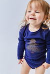 Granatowe body z długim rękawem ozdobione nadrukiem choinki z drobnych złotych kropek. Świąteczny akcent w wygodnym wydaniu – miękki materiał i klasyczny krój zapewniają komfort noszenia. Sprawdzi się w domowym zaciszu i na świąteczne spotkania.