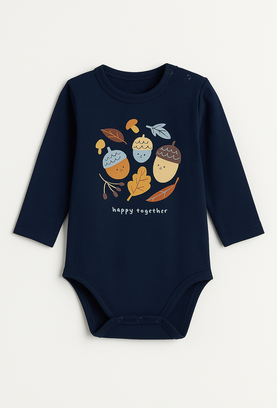 Granatowe body niemowlęce z nadrukiem „Happy Together” to idealna propozycja dla małych chłopców na sezon jesienno-zimowy. Wesoły nadruk przedstawiający trzy urocze żołędzie i liście nadaje ubranku wyjątkowego charakteru i sprawia, że każda stylizacja nabiera uroku. Uszyte z przyjemnej w dotyku dzianiny, body są nie tylko elastyczne, ale również oddychające – doskonałe na co dzień, zarówno w domu, jak i na spacerze. Długie rękawy i zabudowany fason zapewniają ciepło, a zapięcia na ramieniu i w kroku ułatwiają szybkie przebieranie.