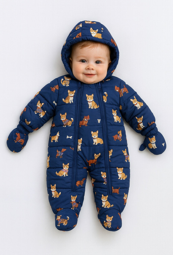Uroczy kombinezon niemowlęcy dla chłopca we wzór wesołych piesków to idealne rozwiązanie na chłodniejsze dni. Zapewnia ciepło, wygodę i ochronę przed wiatrem. Model posiada praktyczny kaptur, zakryte stópki oraz dopinane rękawiczki, które chronią maluszka przed zimnem. Dwustronne zamki błyskawiczne ułatwiają szybkie ubieranie i przewijanie. Stylowy, ciepły i funkcjonalny – idealny towarzysz pierwszych zimowych spacerów Twojego malucha!