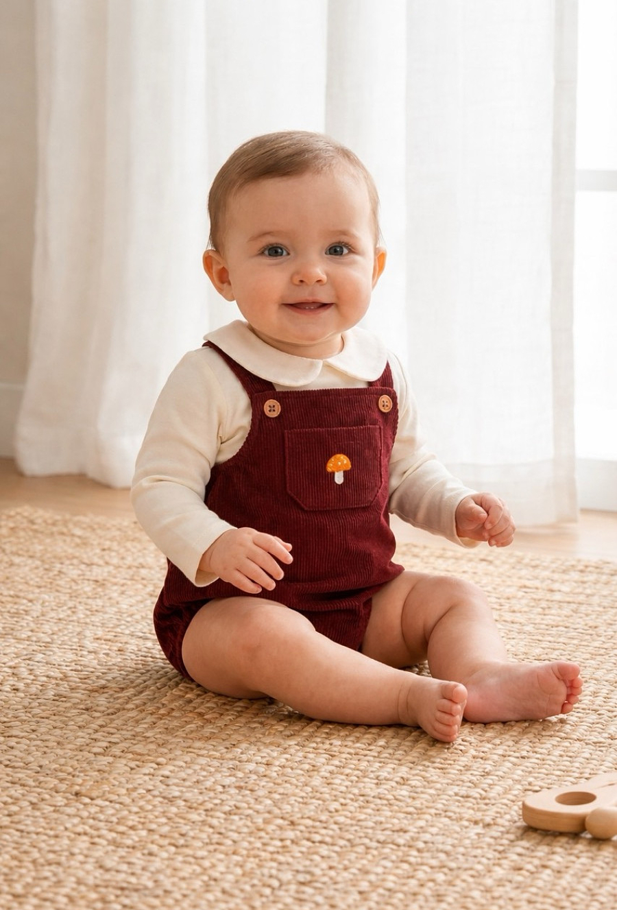 Lomplet dla chłopca, w skład którego wchodzi: body z długim rękawem w kolorze kremowym z ozdobnym kołnierzykiem oraz ogrodniczki w kolorze bordowym z naszywką w kształcie grzybka i zapięciem na guziki. Zestaw wykonany z miękkiej dzianiny i tkaniny, przyjazny dla delikatnej skóry dziecka. Idealny na specjalne okazje, sesje zdjęciowe oraz codzienne, jesienne stylizacje.