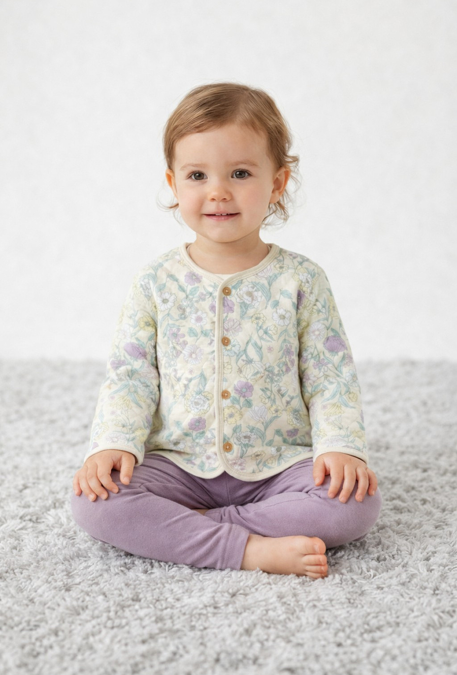 Subtelny, pastelowy wzór kwiatowy na jasnym tle to element, który przyciąga wzrok w przypadku tej oto pikowanej bluzy w kwiaty. Nadaje jej to słodkiego charakteru. Dodatkowo mamy tutaj modny fason bomberki. Taka bluza niemowlęce sprawdzi się podczas chłodniejszych dni i wieczorów. Doskonała do noszenia o każdej porze roku!