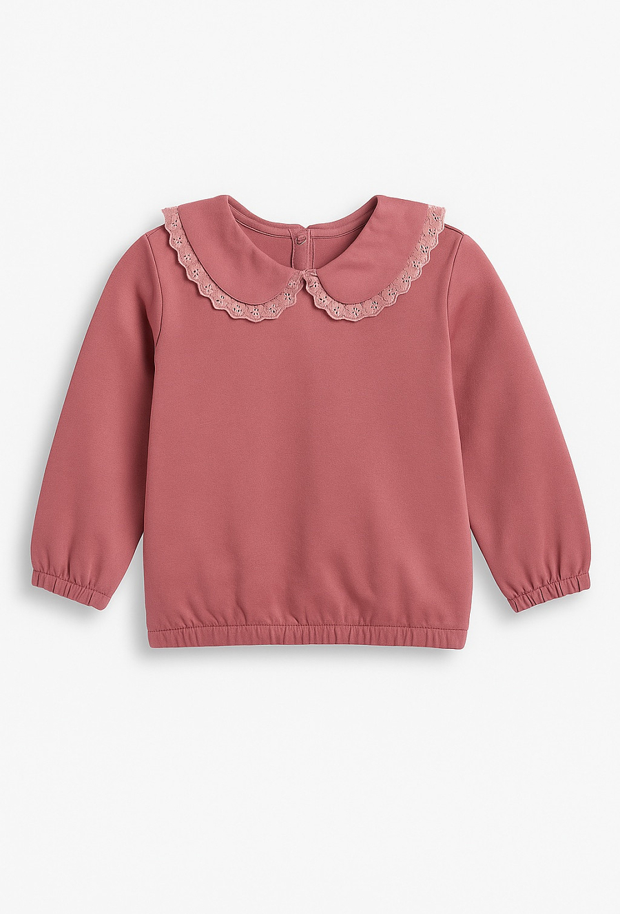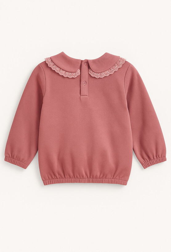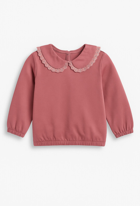 Różowa bluza dziewczęca z koronkowym kołnierzykiem.